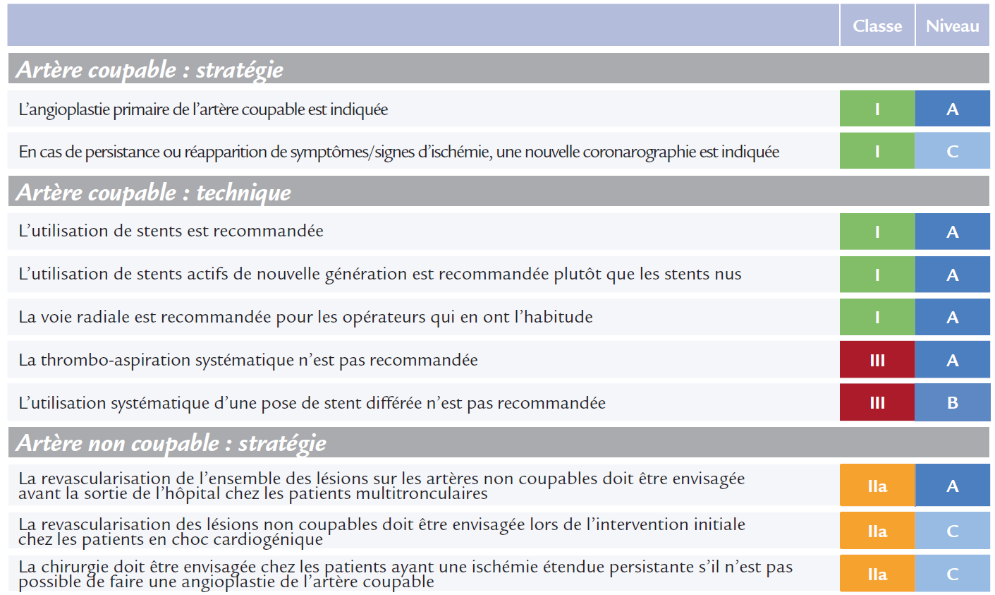L’utilisation de stents actifs récents est recommandée sans ambiguïté, de même que l’abord radial. En revanche, la thromboaspiration systématique est dorénavant déconseillée, de même que le stenting différé après désobstruction de l’artère coupable. Pour ce qui est des patients multitronculaires, la revascularisation de l’ensemble des vaisseaux sténosés avant que le patient ne quitte l’hôpital doit être envisagée.