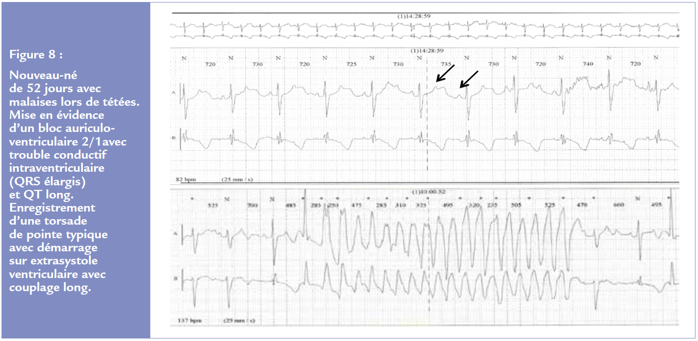 Les QT longs peuvent se révéler en période néonatale voire foetale par des torsades de pointe responsables d’absences/convulsions/syncopes/mort subite chez l’enfant. L’ECG intercritique sera très évocateur avec un intervalle QT allongé (plus de 490 ms chez le nouveau-né) ou un bloc 2/1 associé (en faveur d’un syndrome de QT long de type 2, Figure 8). Un typage génétique sera nécessaire associé à un traitement bétabloqueur par propranolol chez le nouveau-né en 3 prises puis par nadolol en 2 prises dès que possible. Une stimulation cardiaque définitive voire une sympathectomie thoracique pourra être proposée. Un défibrillateur pourra être discuté dans les cas les plus graves.